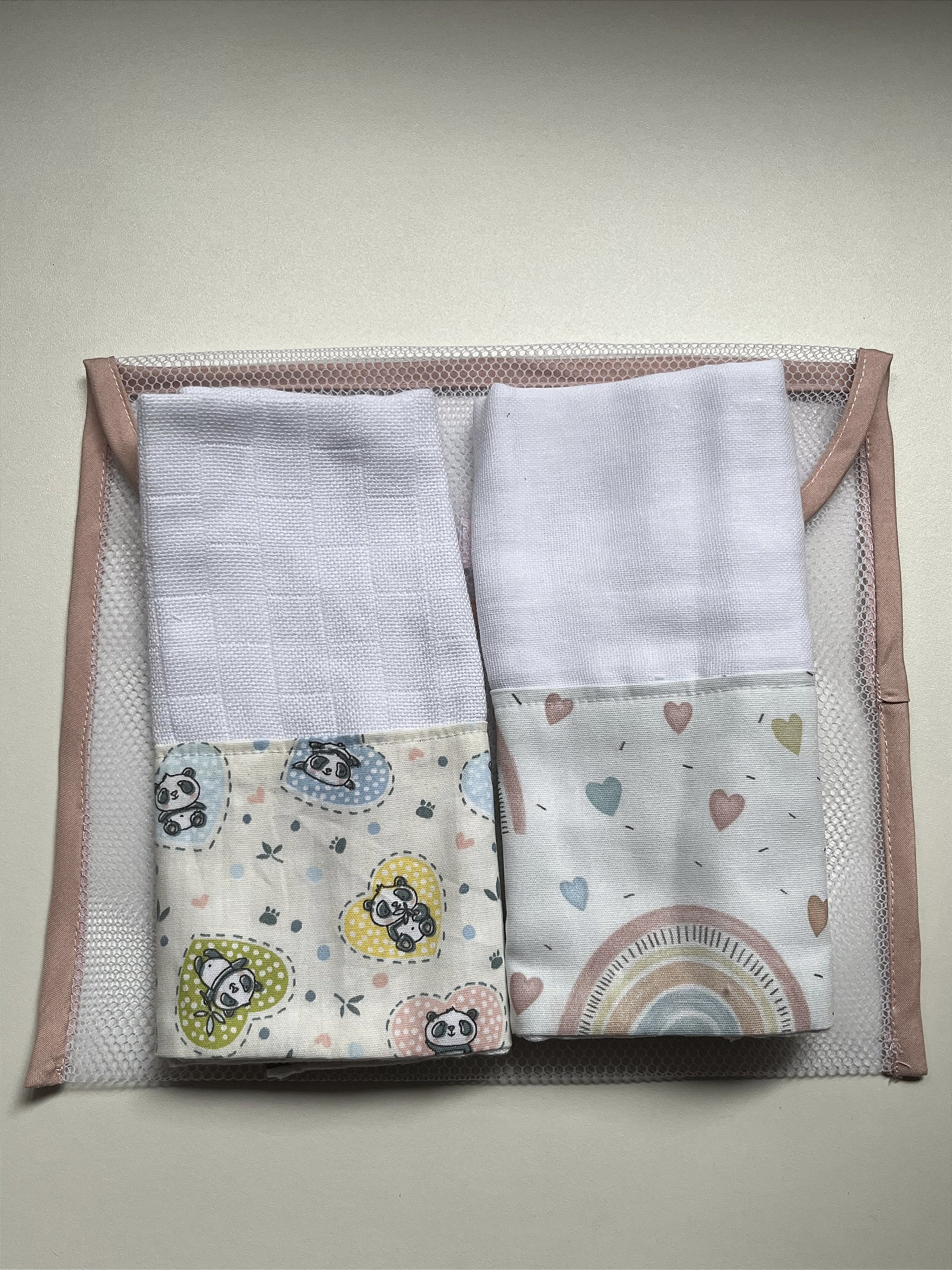 Fraldinhas de pano pequenas que chamamos de fraldinha de boca, são coringas no enxoval do bebê. Que auxiliam as mamadas para a limpeza delicada da boquinha e rosto dos bebês.